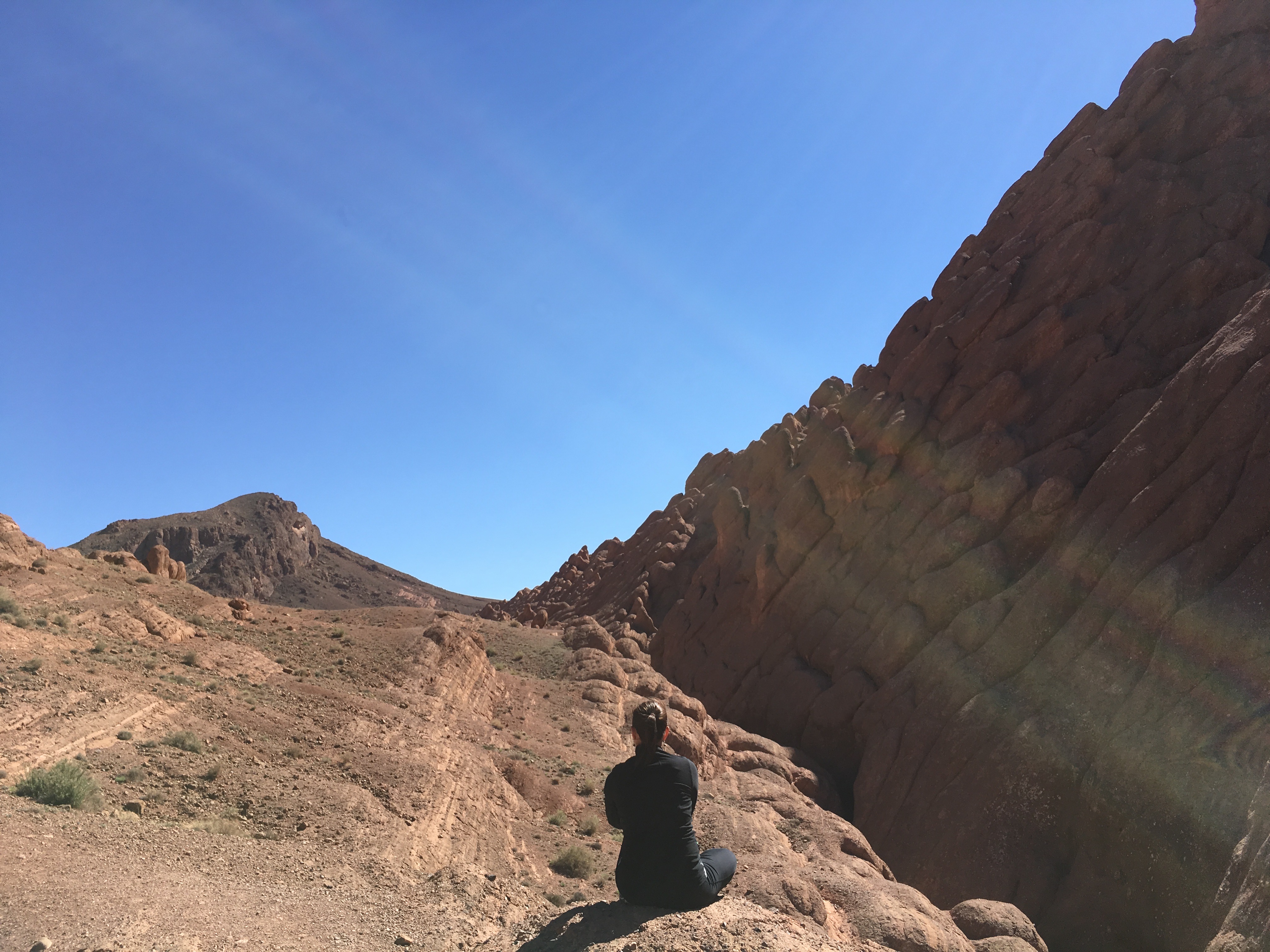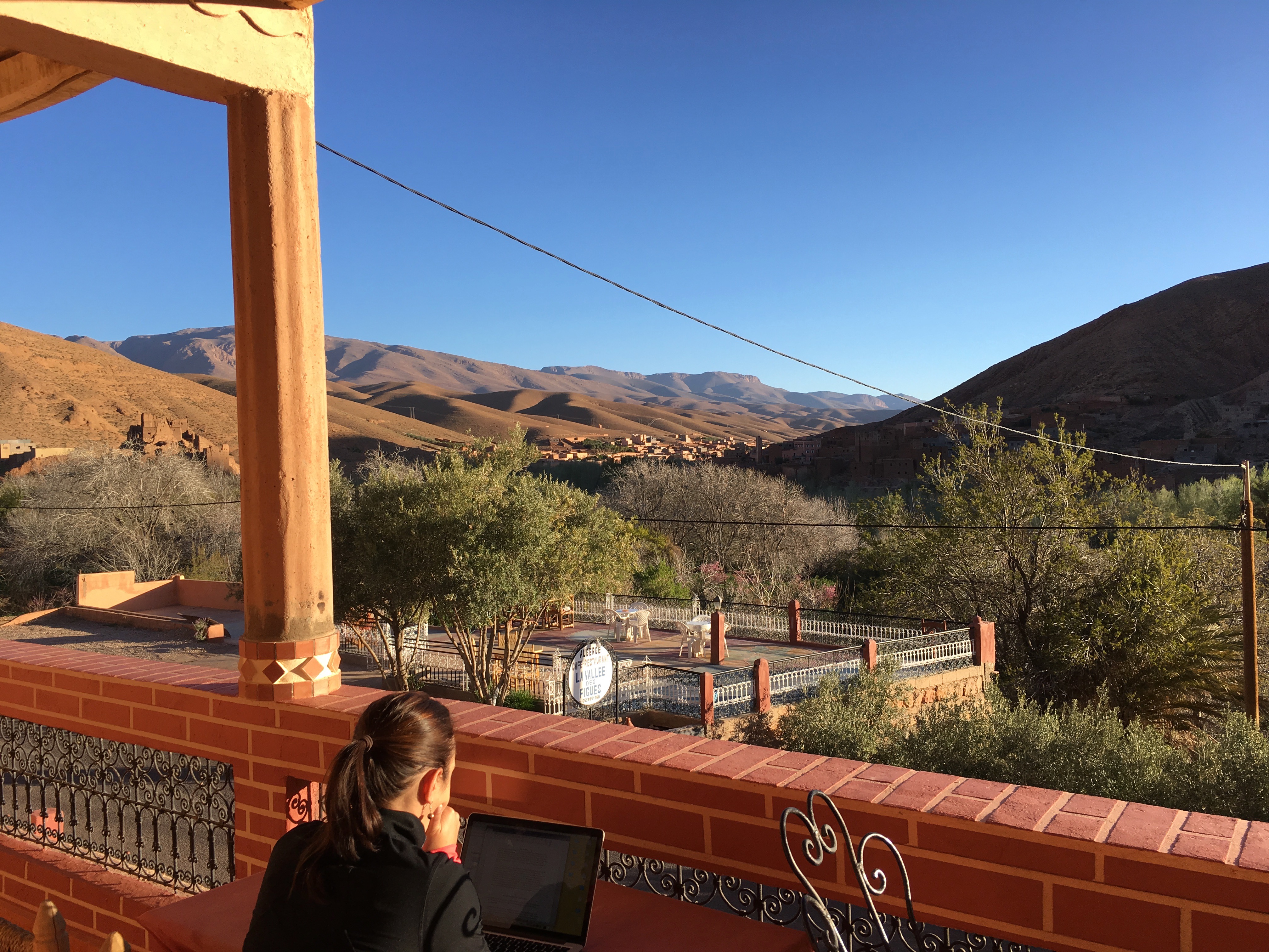 - Pour profiter de la vue du balcon de votre petit hôtel, qui risque d’avoir des allures fatiguées, oui, mais dont le décor est authentique, et le personnel très accueillant. C’est dans notre petite auberge, La Vallée des Figues, que nous avons mangé le meilleur tajine au poulet, agneau et figues, cuisiné par la maman de Brahim, notre hôte. Nous avons aussi pris notre petit-déjeuner dehors, en contemplant les Gorges de Dadès. La vue est à couper le souffle! J’ai d’ailleurs profité de ce moment inspirant pour travailler un petit peu sur le balcon. Ah, que le soleil me faisait du bien!